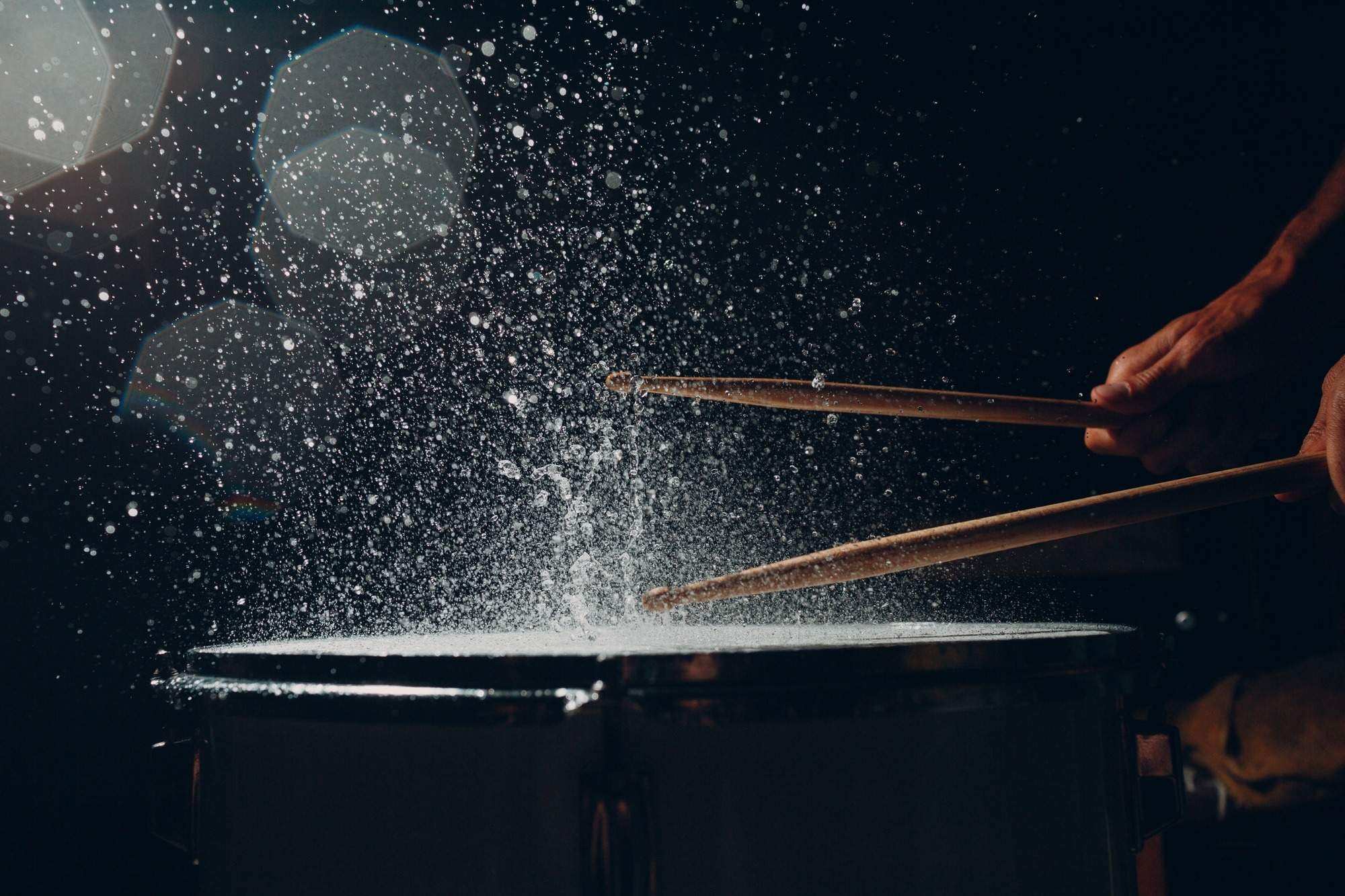 Drum sticks drumming beat rhythm on drum surface with splash water drops